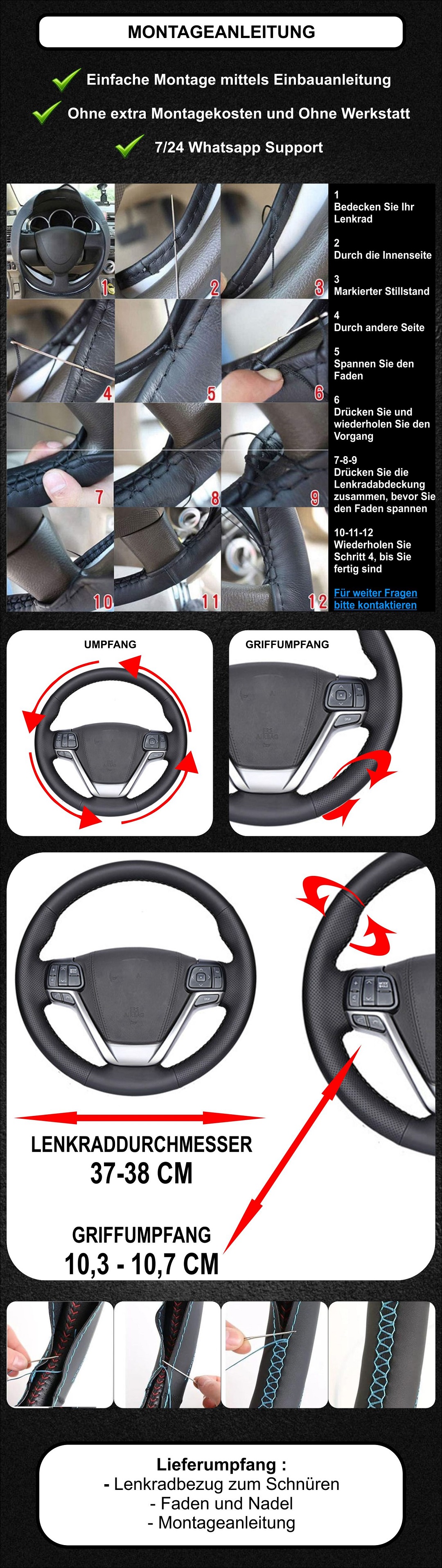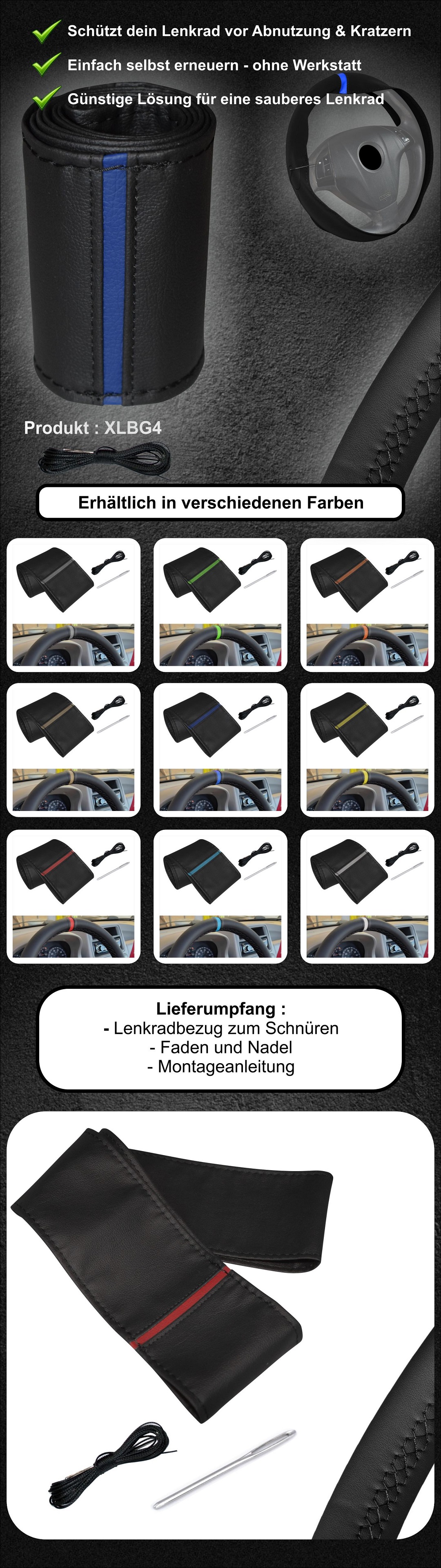 XLBG4 Xkeribom Leder Lenkradbezug zum Schnüren 37-38cm 12 Uhr Markierung mit Farbauswahl