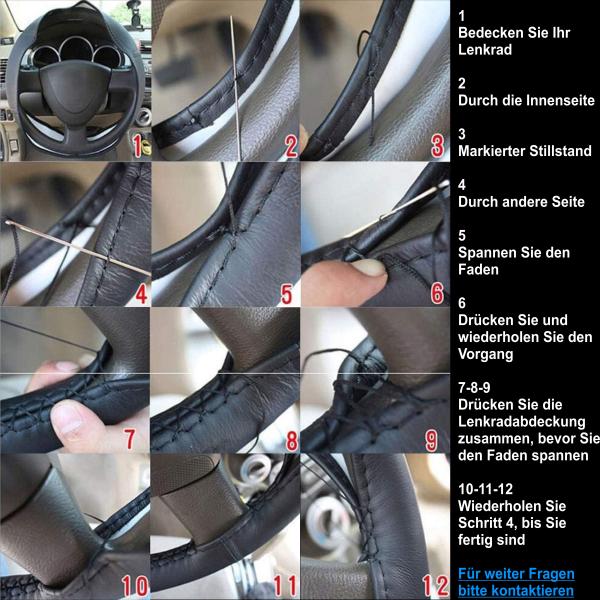 Unsere Lenkradbezüge sind mit Nadeln und Fäden ausgestattet. Das Nähen ist ganz einfach und macht Spaß